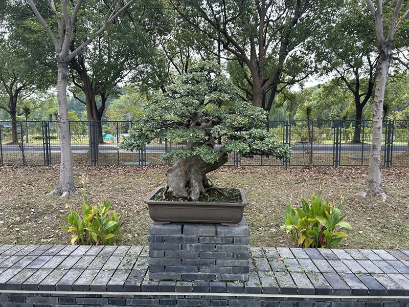 随后,调研团前往吴中区杨贵生先生的“遂苑”盆景园进行走访。该园主要培育黑松、赤松、黄山松、五叶松、大阪松、真柏、侧柏、龙柏等松柏类盆景,以及金弹子、榔榆等大型盆景。杨贵生作为盆景名家,在盆景制作方面精艺求精、技艺精湛,其经手打理的盆景虬枝盘曲、气韵生动、苍劲挺拔。调研团成员听取了杨贵生关于盆景制作与养护管理经验的介绍,并就盆景修剪、蟠扎、摘心、舍利干制作、病虫害防治等技艺进行了现场交流。